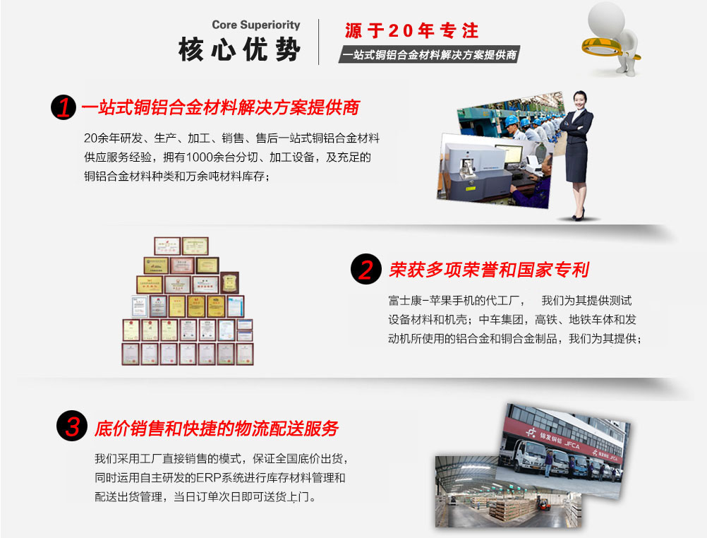 深圳市錦發(fā)銅鋁有限公司成立于1998年,注冊資金1億元人民幣,是一家國家高新技術(shù)企業(yè),榮獲廣東省著名商標稱號。總部及生產(chǎn)基地位于深圳寶安松崗,占地面積3萬多平方。公司成立以來,一直專注于鋁材、銅材等合金材料的研發(fā)、生產(chǎn)加工及銷售。倉儲上萬噸銅鋁合金材料,迅速響應(yīng)客戶需求。